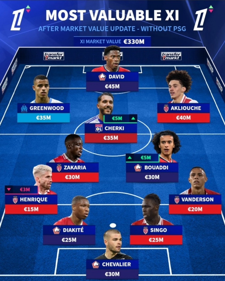 前鋒:克瓦拉茨赫利亞(8000萬歐,下降500萬歐)、登貝萊(7500萬歐,上漲2000萬歐)、巴爾科拉(7000萬歐,上漲500萬歐)