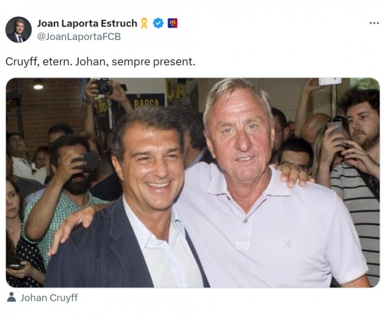 3月25日訊 巴薩俱樂部主席拉波爾塔更新社媒動態(tài),悼念克魯伊夫。克魯伊夫逝世九周年之際,拉波爾塔在社交媒體上曬出與這位俱樂部傳奇的合照,并配文:“克魯伊夫,永恒不朽;約翰,永伴我們。” 本文標簽: 足球 西甲 巴塞羅那