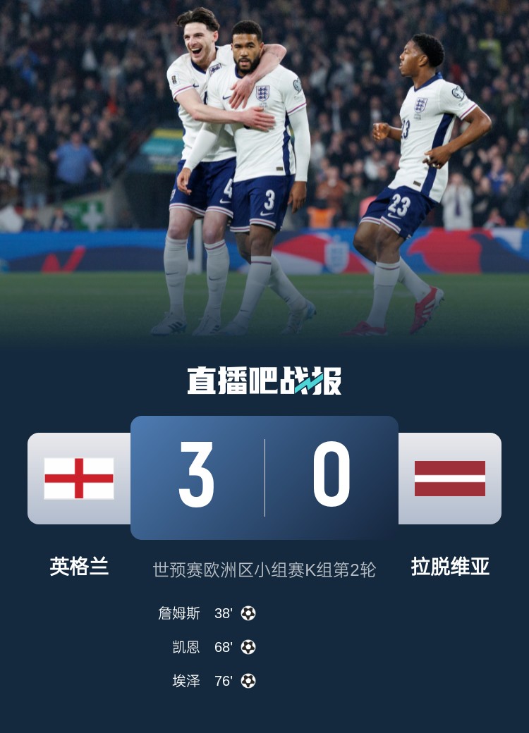 里斯-詹姆斯精彩任意球破門,賴斯助攻凱恩破門,埃澤單兵爆破建功。最終,英格蘭3-0戰(zhàn)勝拉脫維亞,世預(yù)賽2連勝暫3分領(lǐng)跑K組。