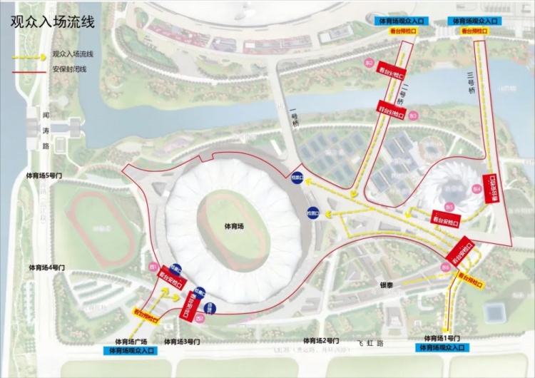 抵達(dá)現(xiàn)場(chǎng)的觀眾,可經(jīng)由 1 號(hào)門、西廣場(chǎng)、2 號(hào)橋以及 3 號(hào)橋前往體育場(chǎng)入口,有序入場(chǎng)。建議龍之隊(duì)、長(zhǎng)城、中國(guó)制躁等有組織的球迷通過(guò)3號(hào)橋?qū)S猛ǖ赖竭_(dá)安檢口。