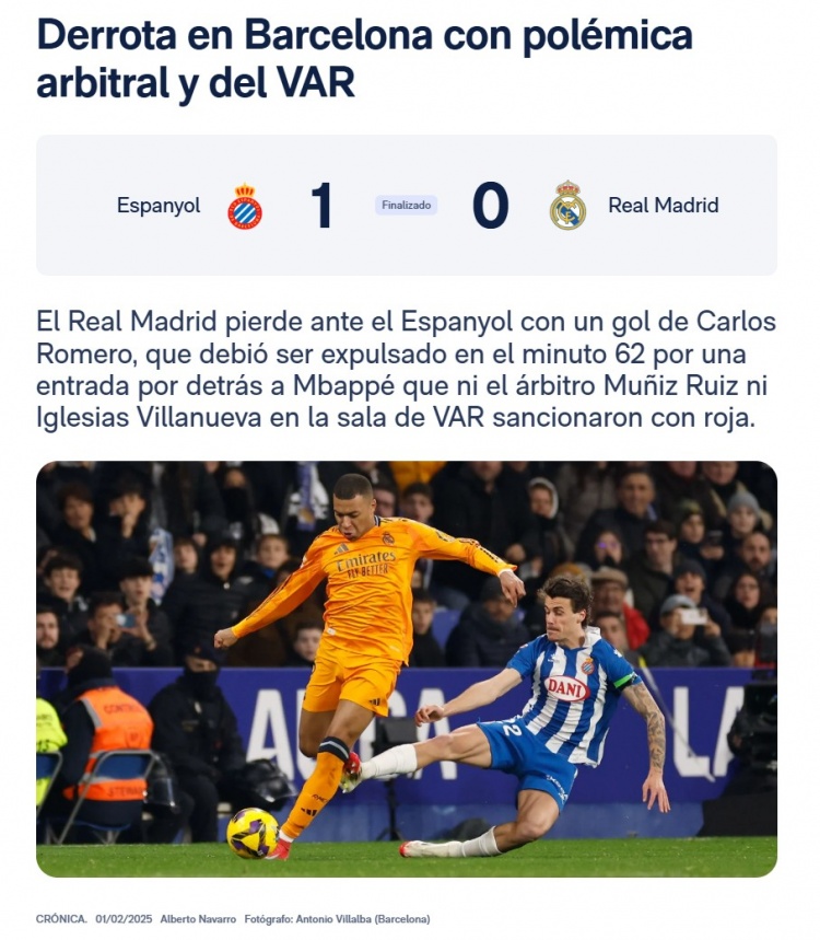 皇馬在RCDE體育場(chǎng)輸給了西班牙人,主裁判穆尼茲-魯伊斯和伊格萊西亞斯-比利亞努埃瓦在VAR中的表現(xiàn)令人印象深刻。卡洛斯-羅梅羅從背后鏟倒姆巴佩,兩名裁判均未出示紅牌。上半場(chǎng),穆尼茲-魯伊斯還判罰維尼修斯的進(jìn)球無(wú)效,理由是姆巴佩之前對(duì)波爾-洛薩諾犯規(guī)。
