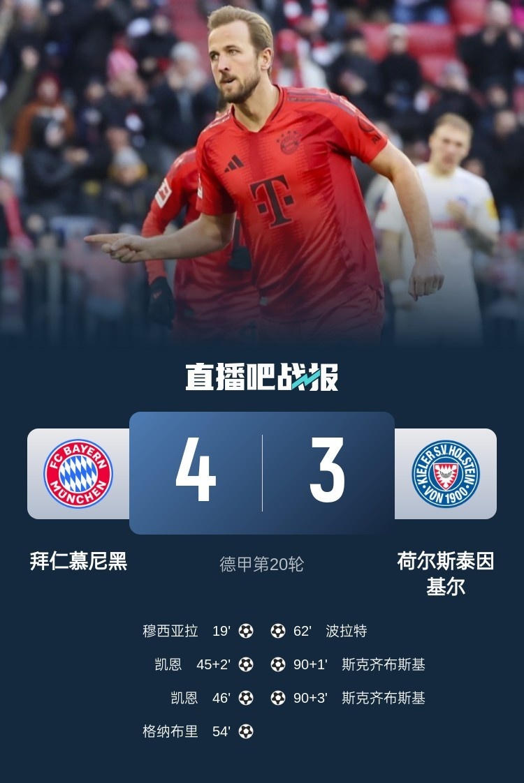 驚險(xiǎn)!拜仁補(bǔ)時(shí)連丟2球4-3基爾 拜仁聯(lián)賽6連勝暫9分領(lǐng)跑&凱恩雙響
