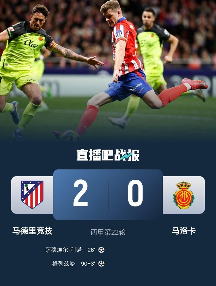 西甲-馬競(jìng)2-0馬洛卡先賽距榜首1分 利諾建功格列茲曼吊射破門