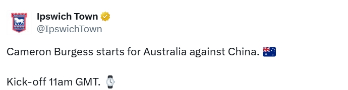 03月25日訊 今晚19:00,世預(yù)賽亞洲區(qū)第三階段C組第8輪,國足將在主場迎戰(zhàn)澳大利亞。英超球隊伊普斯維奇官推發(fā)文,支持首發(fā)出戰(zhàn)的澳大利亞球員卡梅隆-伯吉斯。伊普斯維奇社媒:卡梅倫·伯吉斯首發(fā)代表澳大利亞隊對陣中國隊。格林威治時間上午11點開球。卡梅隆-伯吉斯司職中衛(wèi),本賽季為伊普斯維奇出場15次,貢獻2個助攻。 本文標(biāo)簽: 足球 英超 伊普斯維奇 國家隊 澳大利亞