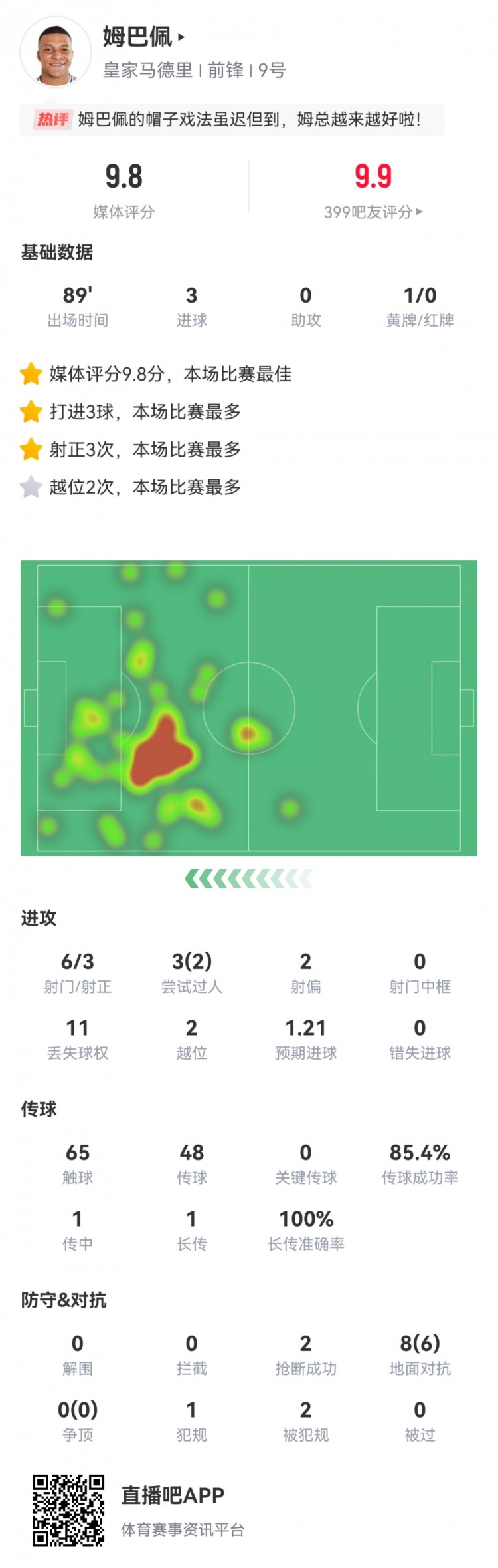1月26日訊 本輪西甲,皇馬3-0客勝巴拉多利德,姆巴佩上演皇馬生涯首次帽子戲法。球員全場重點(diǎn)數(shù)據(jù)如下↓6射3正3粒進(jìn)球3次過人成功2次11次丟失球權(quán)2次越位預(yù)期進(jìn)球1.2165次觸球傳球成功率85.4%2次搶斷8次對抗成功6次全場最高9.8分 本文標(biāo)簽: 足球 姆巴佩 西甲 皇家馬德里