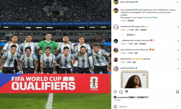阿根廷門將馬丁內(nèi)斯也在社媒曬出本場(chǎng)球隊(duì)首發(fā)合影,配文寫道:“感謝大家的熱情支持,我們?cè)趫?chǎng)上努力付出一切,這支球隊(duì)永不會(huì)停下腳步!”