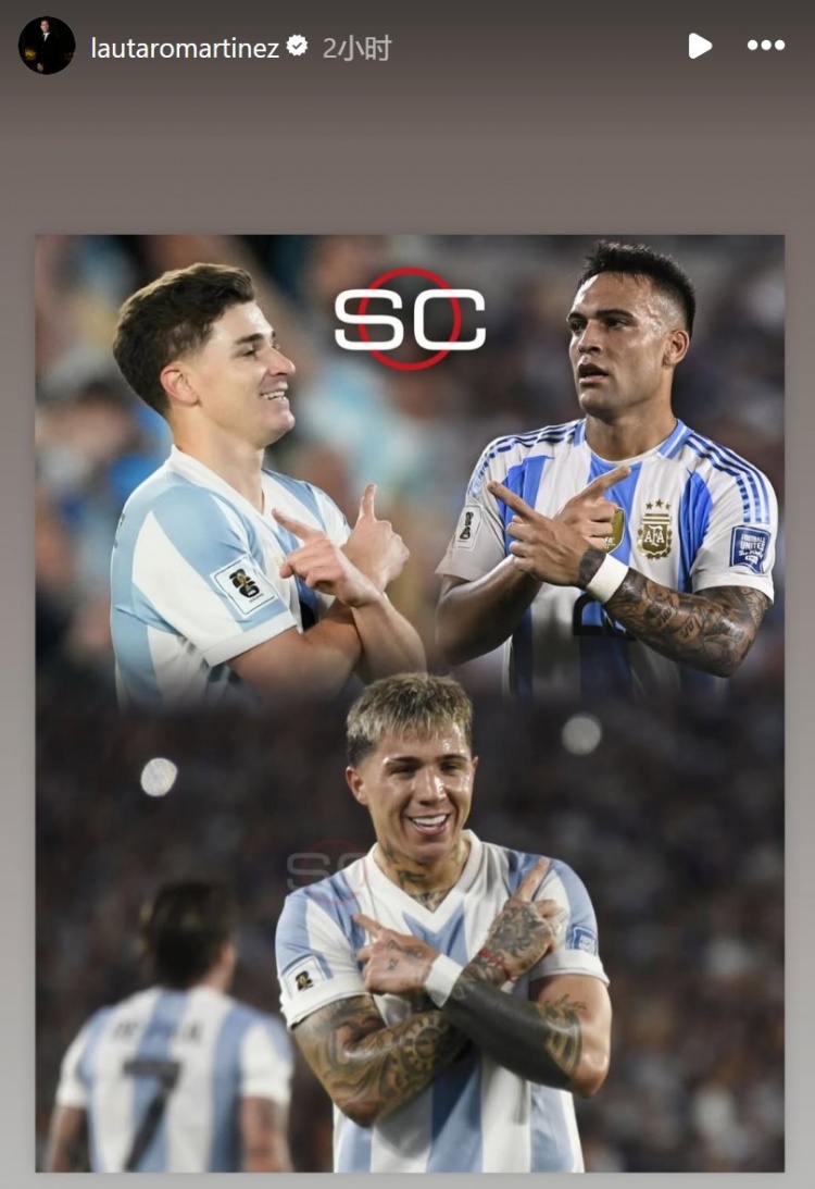 3月26日訊 在本輪南美區(qū)世預(yù)賽,阿根廷4-1大勝巴西。本場比賽勞塔羅因傷缺戰(zhàn),而阿爾瓦雷斯、恩佐在進(jìn)球后都做出了勞塔羅標(biāo)志性慶祝動作。勞塔羅也在個人社媒轉(zhuǎn)發(fā)了三人進(jìn)球后同樣的慶祝動作照片。 本文標(biāo)簽: 足球 國家隊 阿根廷 意甲 國際米蘭