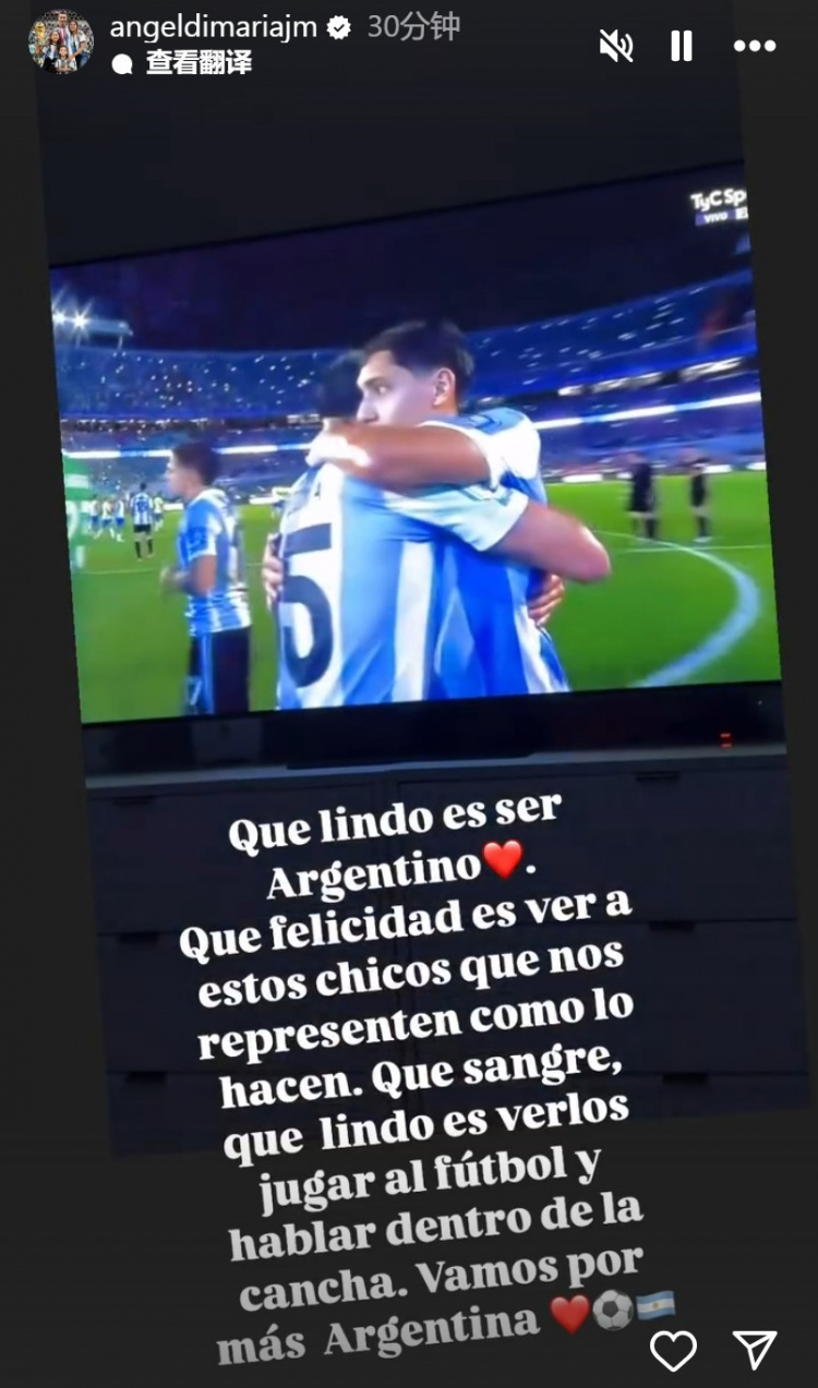 3月26日訊 世界杯預選賽南美區(qū),阿根廷4-1大勝巴西,拿到?jīng)Q賽圈參賽資格。賽后,迪馬利亞更新社媒,稱贊了阿根廷球員們。迪馬利亞曬出自己在家中觀賽的照片,并寫道:“作為阿根廷人是多么美好啊??。看到這些孩子們用他們的方式代表這支球隊出戰(zhàn),我們感到非常高興。多么熱血,看到他們在場上踢球、聊天是多么美好。讓我們更加努力吧,阿根廷??!”在去年美洲杯奪冠后,迪馬利亞正式從國家隊退役。 本文標簽: 足球 阿根廷 葡超