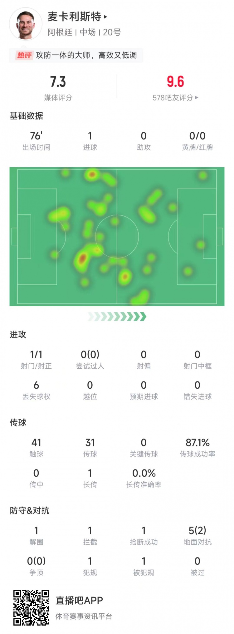 麥卡利斯特本場(chǎng)比賽數(shù)據(jù):