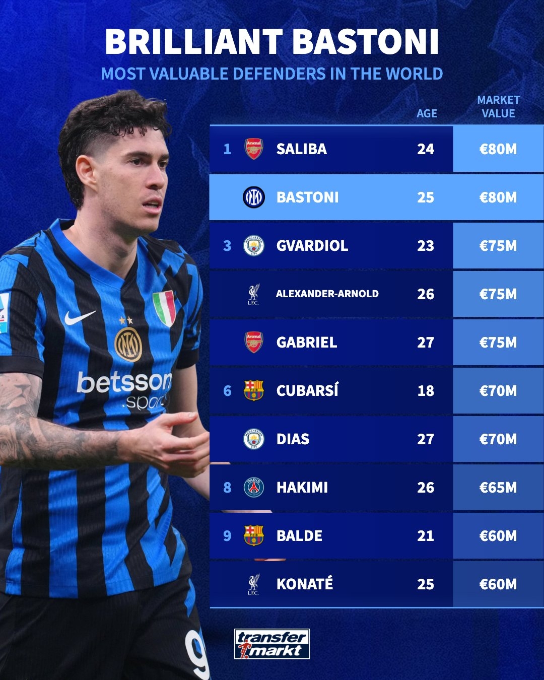 德轉最新后衛(wèi)身價top10:巴斯托尼8000萬歐,與薩利巴并列第1