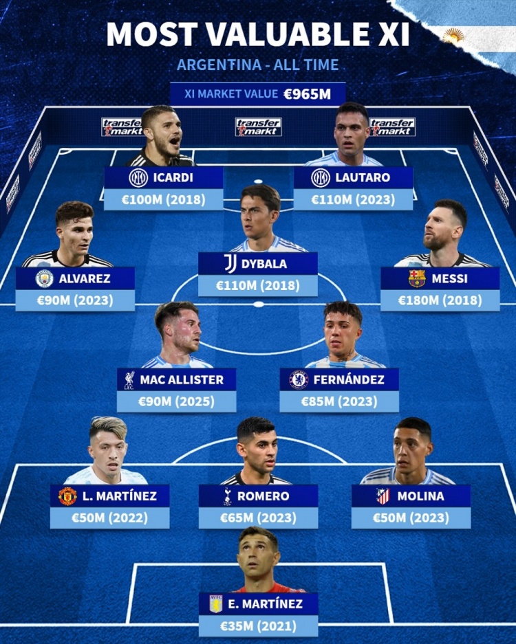 阿根廷歷史德轉(zhuǎn)身價(jià)最高陣容(總價(jià)9.65億歐)