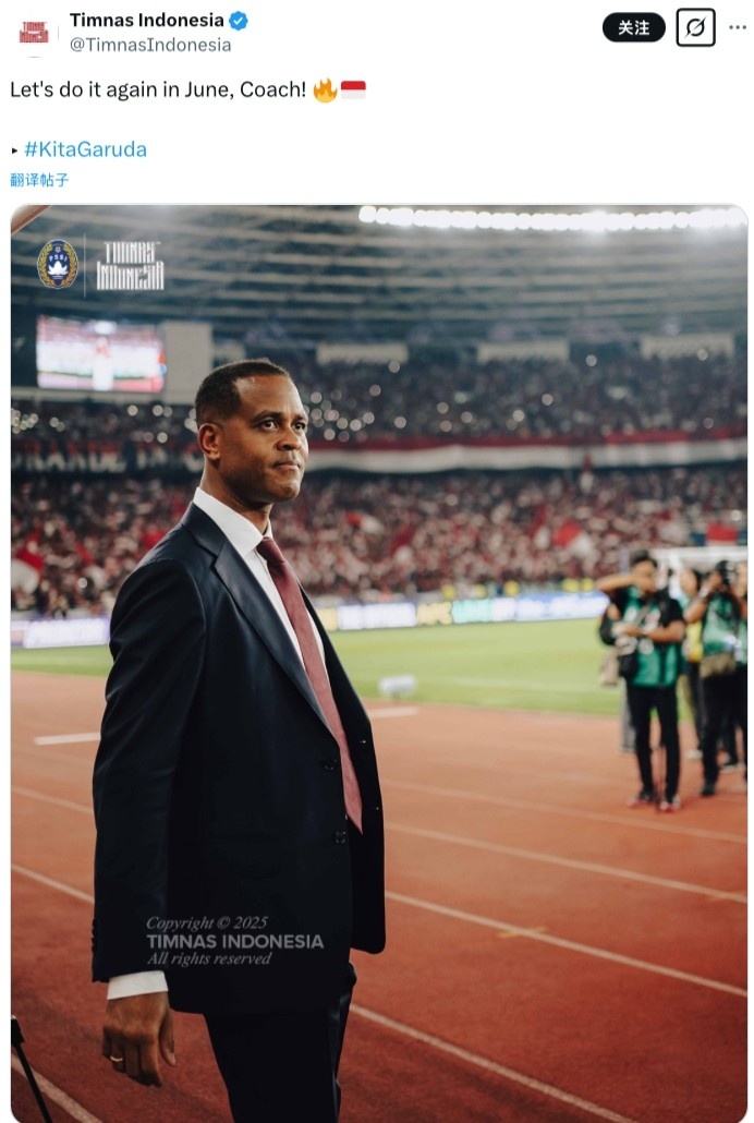 印尼國(guó)家隊(duì)官推今日更新社媒,曬出克魯伊維特在場(chǎng)邊執(zhí)教的照片,并配文寫道:“讓我們6月份再來一次,教練!”