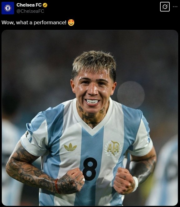 切爾西官推曬恩佐在阿根廷隊(duì)的照片:哇哦,多么出色的表現(xiàn)!