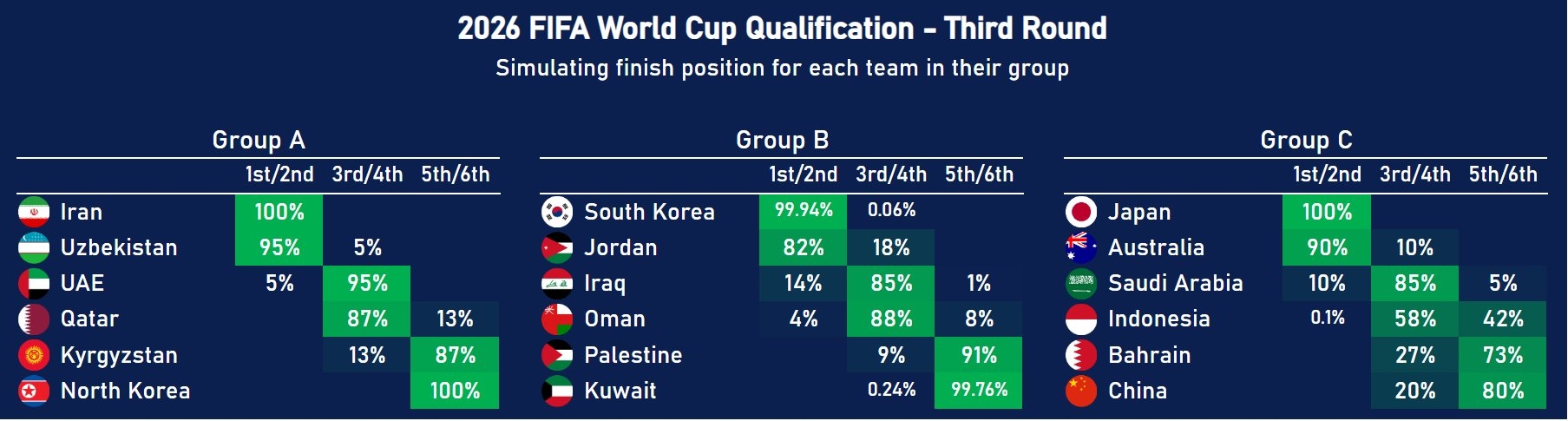 03月26日訊 數(shù)據(jù)機(jī)構(gòu)Footy Rankings發(fā)布世預(yù)賽預(yù)測(cè)。其中中國(guó)隊(duì)20%排3/4(附加賽),80%排在5/6(無(wú)緣世界杯),而印尼58%概率獲得附加賽資格。 本文標(biāo)簽: 足球 中國(guó)男足 中國(guó)足球 中超