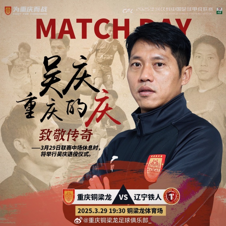 3月26日訊 3月29日晚,中甲聯(lián)賽第2輪重慶銅梁龍將在主場對陣遼寧鐵人。重慶銅梁龍俱樂部官方宣布,將在本場比賽中場休息時舉行吳慶退役儀式,向傳奇致敬。
