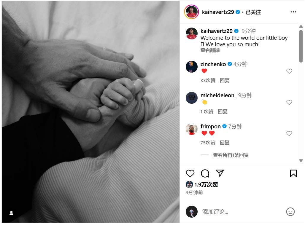 03月26日訊 哈弗茨在社交媒體曬出照片,宣布兒子的出生。哈弗茨寫道:我們的小男孩,歡迎來到這個世界。我們愛你。哈弗茨和妻子索菲婭-韋伯于去年7月舉辦婚禮,索菲婭-韋伯是一名模特,哈弗茨與她相識于2018年。去年11月,索菲婭-韋伯宣布懷孕。 本文標(biāo)簽: 足球 英超 阿森納
