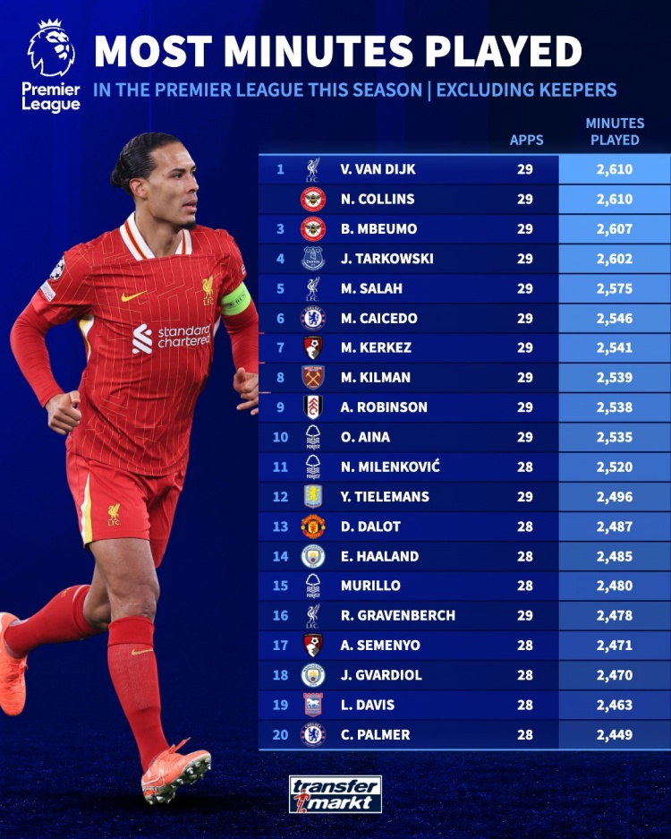 3月27日訊 德轉(zhuǎn)統(tǒng)計(jì)了本賽季出場(chǎng)時(shí)間最多的20名英超外場(chǎng)球員(即非門(mén)將球員)。其中,范迪克和科林斯打滿29場(chǎng)比賽居首,薩拉赫第5、凱塞多第6。