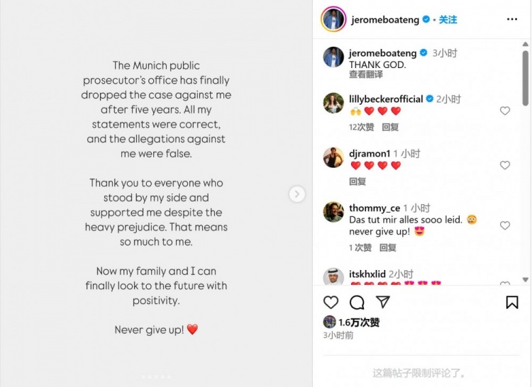 3月27日訊 博阿滕更新社媒,慶賀針對(duì)他的家暴指控被撤銷。博阿滕寫道:慕尼黑檢察院終于在五年后放棄了對(duì)我的指控。我所有的陳述都是正確的,對(duì)我的指控都是不實(shí)的。感謝所有在我遭受嚴(yán)重偏見時(shí)依然站在我身邊支持我的人。這對(duì)我意義重大。現(xiàn)在,我的家人和我終于可以帶著積極的心態(tài)面對(duì)未來。永不放棄!?? 本文標(biāo)簽: 足球 德甲 拜仁慕尼黑 德國(guó)