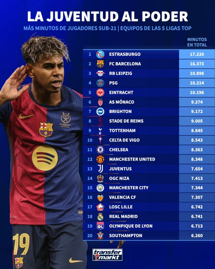 3月27日訊 德國(guó)轉(zhuǎn)會(huì)市場(chǎng)統(tǒng)計(jì)了本賽季五大聯(lián)賽球隊(duì)U21球員的總出場(chǎng)時(shí)間,并列出榜單,斯特拉斯堡居首,巴塞羅那、萊比錫排名二三位。