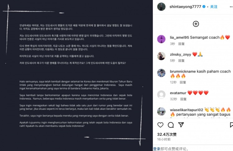 2月2日訊 今日前印尼主帥申臺(tái)龍更新社媒,用韓語(yǔ)和印度尼西亞語(yǔ)發(fā)布聲明,對(duì)部分印尼媒體進(jìn)行警告。