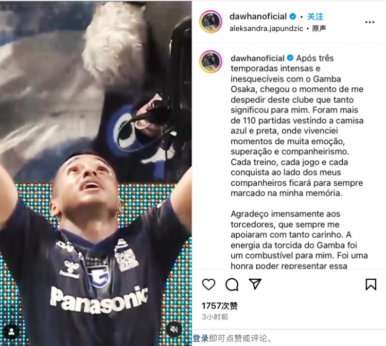 在轉(zhuǎn)會(huì)官宣后,達(dá)萬(wàn)社媒發(fā)布視頻集錦,向大阪鋼巴球迷告別。他寫(xiě)道: