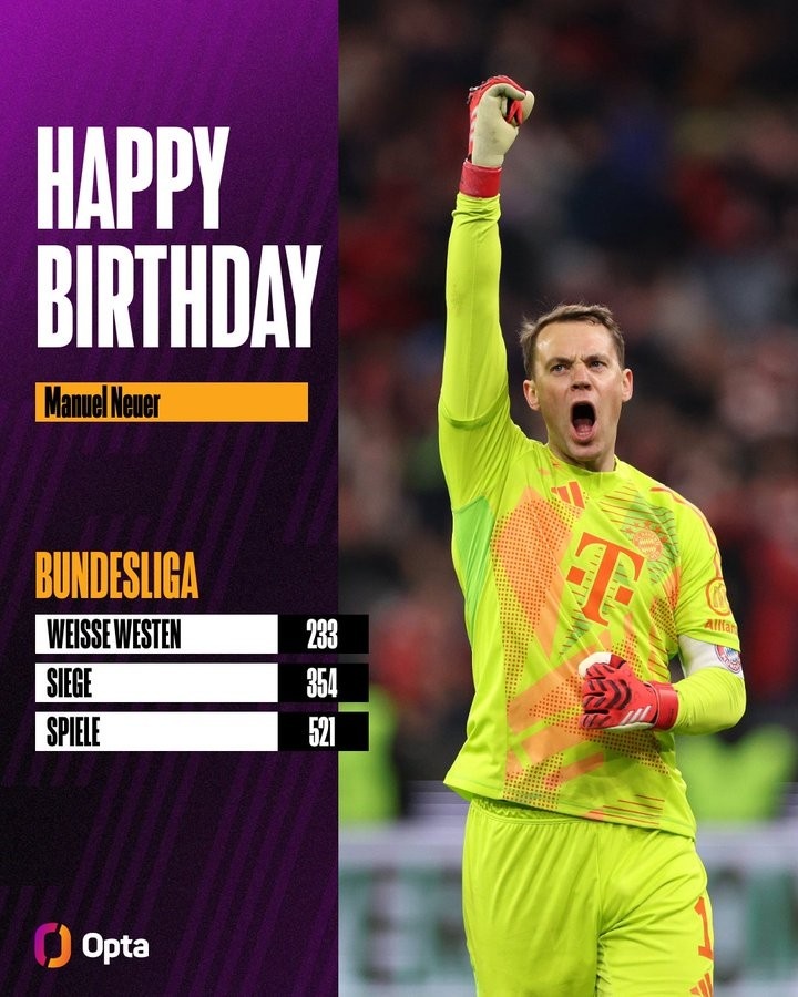 3月27日訊 拜仁老將諾伊爾在今日迎來39歲生日,opta數(shù)據(jù)統(tǒng)計顯示他在多項數(shù)據(jù)方面已名列德甲歷史前茅。數(shù)據(jù)統(tǒng)計顯示,諾伊爾233次零封是德甲歷史最多,德甲354勝位列歷史次席(僅次于隊友托馬斯-穆勒),德甲521次出場則是門將歷史第3(卡恩和伊梅爾分列前二)。 本文標簽: 足球 德甲 拜仁慕尼黑