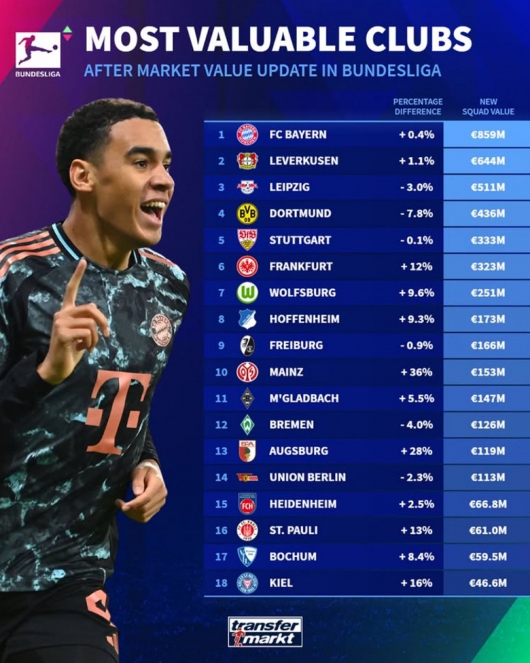 3月28日訊 德轉(zhuǎn)在當(dāng)?shù)貢r(shí)間3月27日更新了德甲球員身價(jià),并列出了德甲各隊(duì)身價(jià)排名,拜仁8.59億歐居首,勒沃庫森、萊比錫、多特、斯圖加特2-5位。