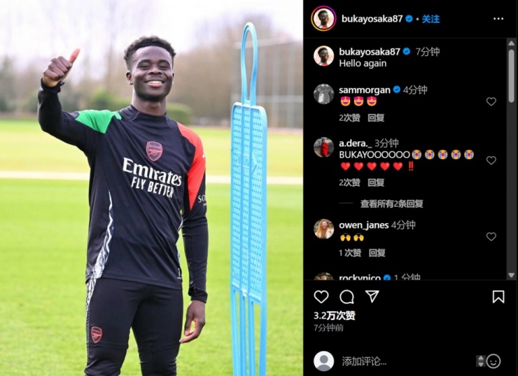 3月28日訊 阿森納邊鋒薩卡更新社媒,曬出自己身穿訓(xùn)練服照片,配文:又見面了。薩卡自去年12月因腿筋傷勢(shì)傷缺至今,據(jù)此前報(bào)道,他接近復(fù)出。受傷前,薩卡本賽季在各項(xiàng)賽事出戰(zhàn)了24場(chǎng)比賽,貢獻(xiàn)9球13助攻。 本文標(biāo)簽: 足球 英超 阿森納