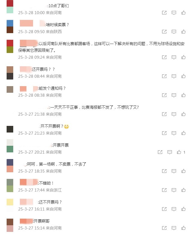 根據(jù)賽程安排,河南隊(duì)將在本輪聯(lián)賽主場對陣上海申花,比賽時(shí)間為3月29日(星期六)18:00。在賽前僅剩一天的時(shí)候,俱樂部仍未售票,也沒有相關(guān)公告,這讓球迷等得非常急迫。在河南隊(duì)官方微博的評論區(qū),球迷們在持續(xù)催促售票。