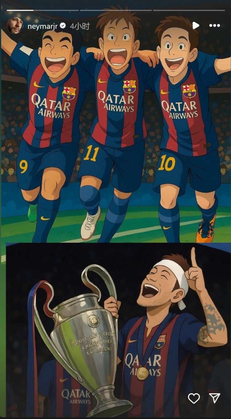 內(nèi)馬爾在社交媒體上曬出與梅西、蘇亞雷斯一起慶祝,以及自己手拿歐冠獎(jiǎng)杯的漫畫(huà)圖片,追憶那段美好的時(shí)光。