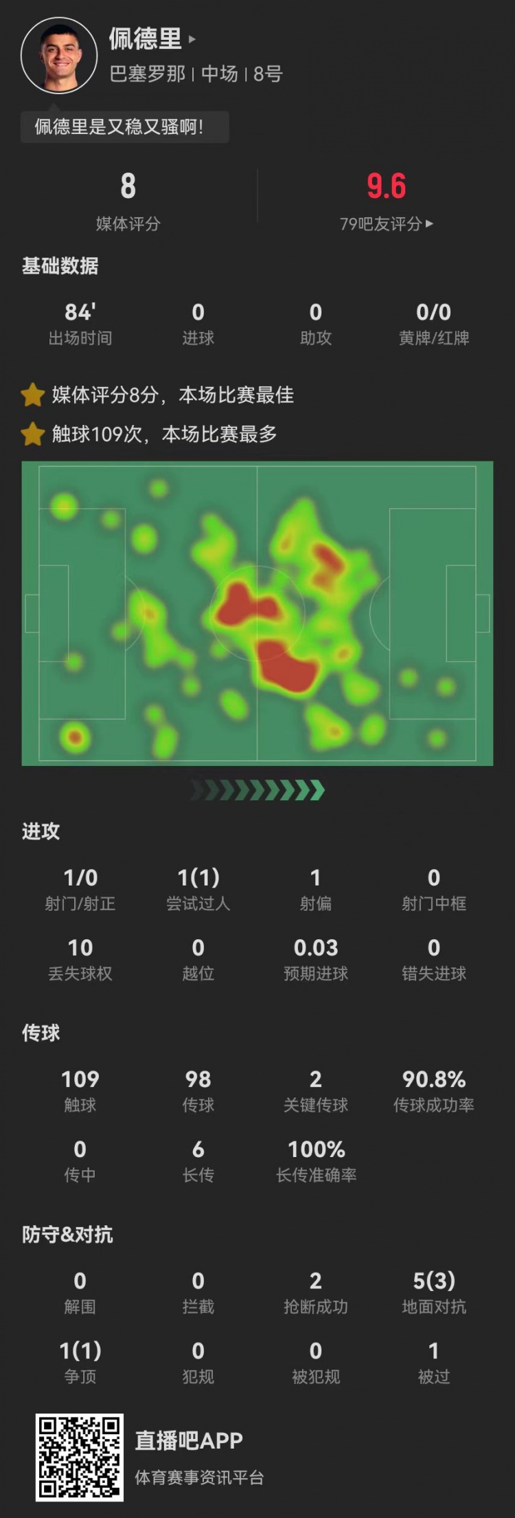 3月28日訊 巴薩在本輪西甲3-0擊敗奧薩蘇納,佩德里在賽后被官方評為全場最佳球員。他本場數(shù)據(jù)如下:首發(fā)出戰(zhàn)84分鐘預(yù)期助攻0.72109觸球98傳球、89成功,成功率91%2關(guān)鍵傳球6長傳、6成功1創(chuàng)造重大機會1過人、1成功6對抗、4成功10丟失球權(quán)2搶斷1被過獲評8.0分 本文標(biāo)簽: 足球 西甲 巴塞羅那 奧薩蘇納