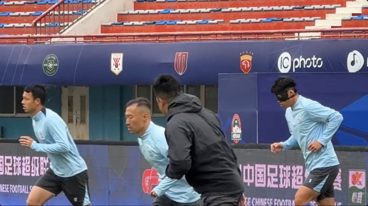 申花今天賽前踩場訓(xùn)練,中衛(wèi)朱辰杰戴面具參加
