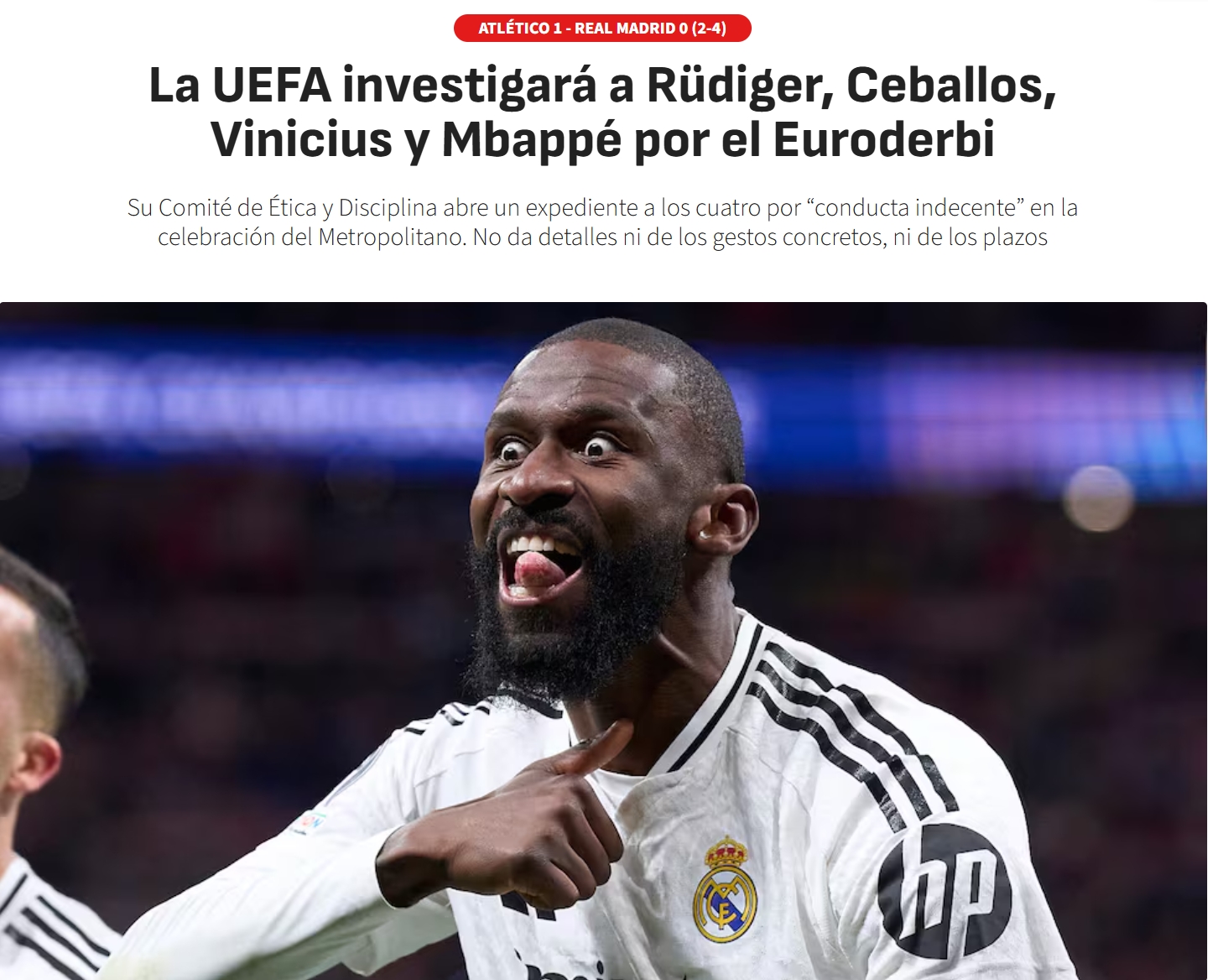 03月28日訊 歐足聯(lián)官方昨日發(fā)布官方公告,宣布對姆巴佩、維尼修斯、呂迪格、塞巴略斯4名皇馬球員在歐冠對馬競賽后的不當行為展開進一步調查。《阿斯報》透露了皇馬俱樂部方面對此的立場。