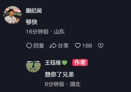 隨后他在U20國足的隊(duì)友蒯紀(jì)聞留言寫道:“夠快。”王鈺棟則回復(fù)稱:“想你了兄弟。”