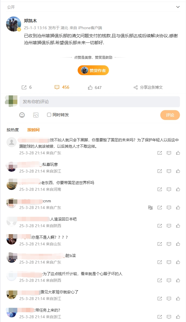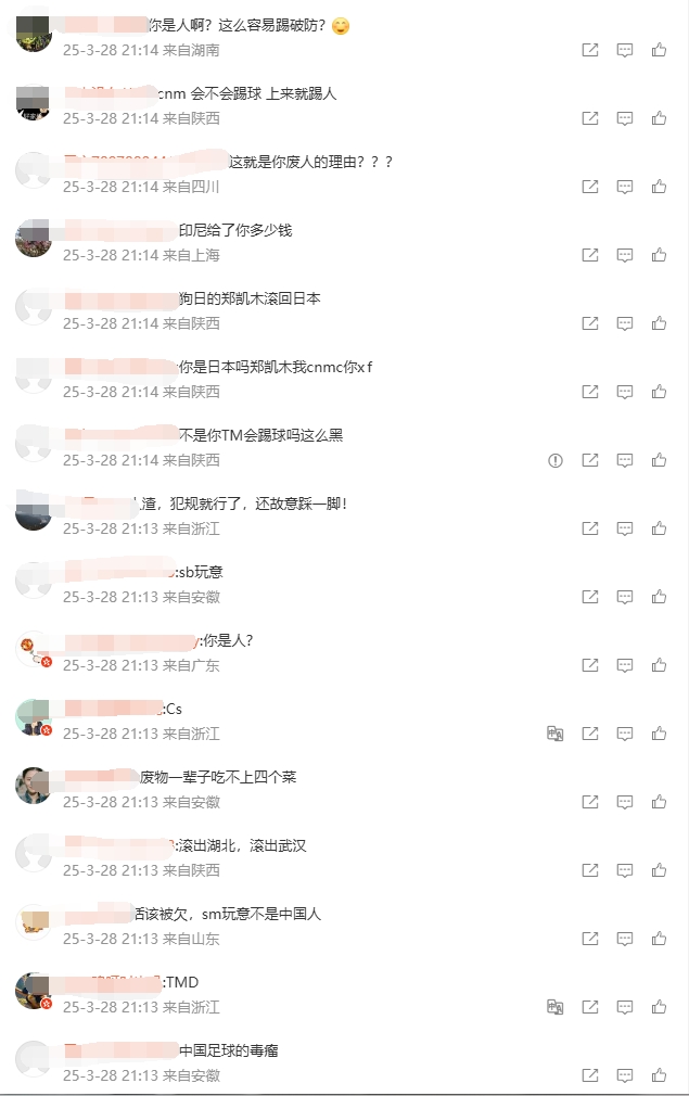 03月28日訊 在本輪中超武漢三鎮(zhèn)vs浙江的比賽中,王鈺棟第47分鐘遭遇鄭凱木身后犯規(guī),痛苦倒地并且被擔架抬下場。不少球迷第一時間沖入鄭凱木的個人微博進行聲討,他最新的一條動態(tài)在短時間內(nèi)被刷了數(shù)百條評論,大多都是在責罵鄭凱木對王鈺棟的犯規(guī)。 本文標簽: 足球 國家隊 中國男足 中國足球 中超 浙江 武漢三鎮(zhèn)