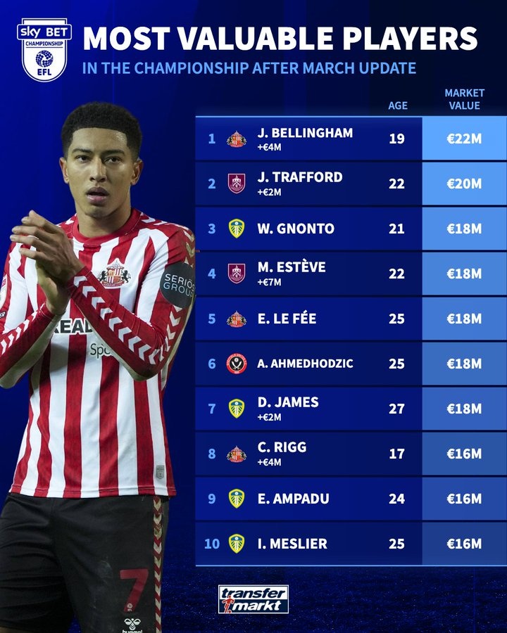 3月28日訊 德國(guó)轉(zhuǎn)會(huì)市場(chǎng)今日曬海報(bào),列出英冠球員身價(jià)排名,小貝林厄姆2200萬(wàn)歐元居首。