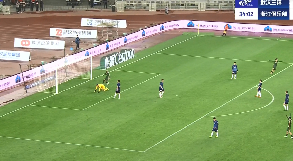 第25分鐘,中場(chǎng)位置李提香送出挑傳到禁區(qū),王鈺棟插上停球內(nèi)切,慌亂之中任航搶先一腳解圍不慎自擺烏龍,VAR長(zhǎng)時(shí)間介入確定王鈺棟接球瞬間是否越位,最終主裁判定進(jìn)球有效,浙江隊(duì)2-0領(lǐng)先↓