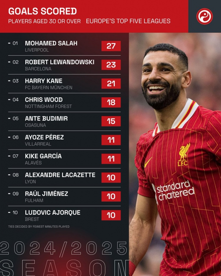 本賽季五大聯(lián)賽30歲及以上球員聯(lián)賽進球榜: