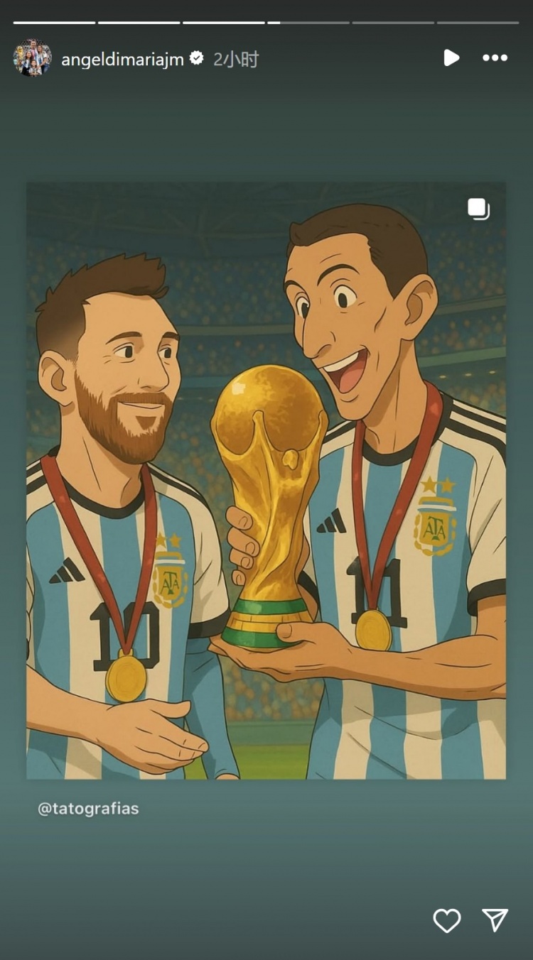2022年卡塔爾世界杯,迪馬利亞與梅西幫助阿根廷隊(duì)贏得冠軍。迪馬利亞在社交媒體上轉(zhuǎn)發(fā)自己與梅西手捧大力神杯的AI漫畫圖片,回顧榮耀時(shí)刻。
