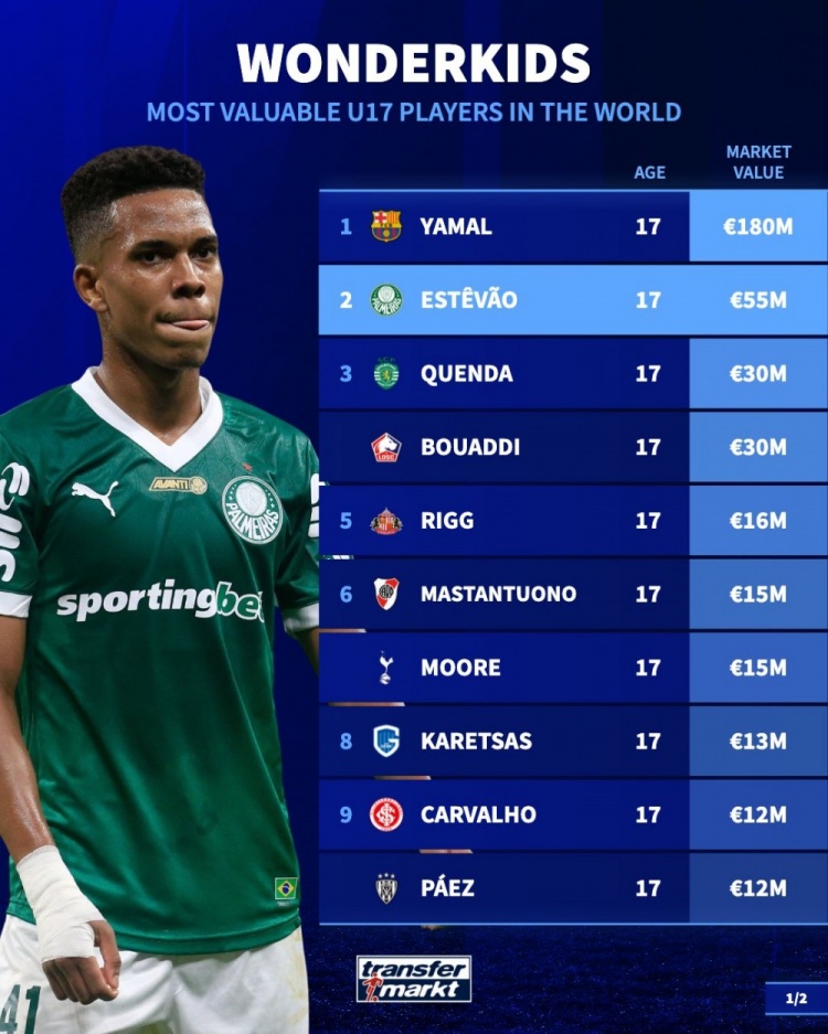 3月29日訊 《轉(zhuǎn)會(huì)市場(chǎng)》完成了球員身價(jià)更新,并列出了U17球員身價(jià)榜,亞馬爾無懸念斷崖領(lǐng)跑,多位球員已經(jīng)被切爾西預(yù)訂。