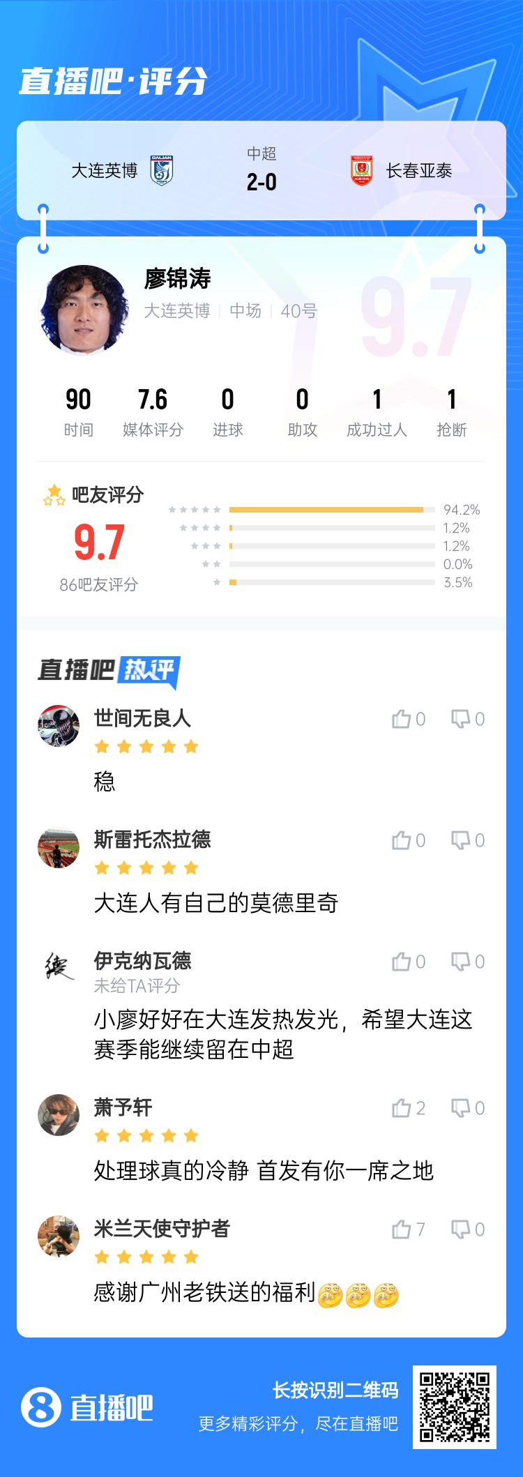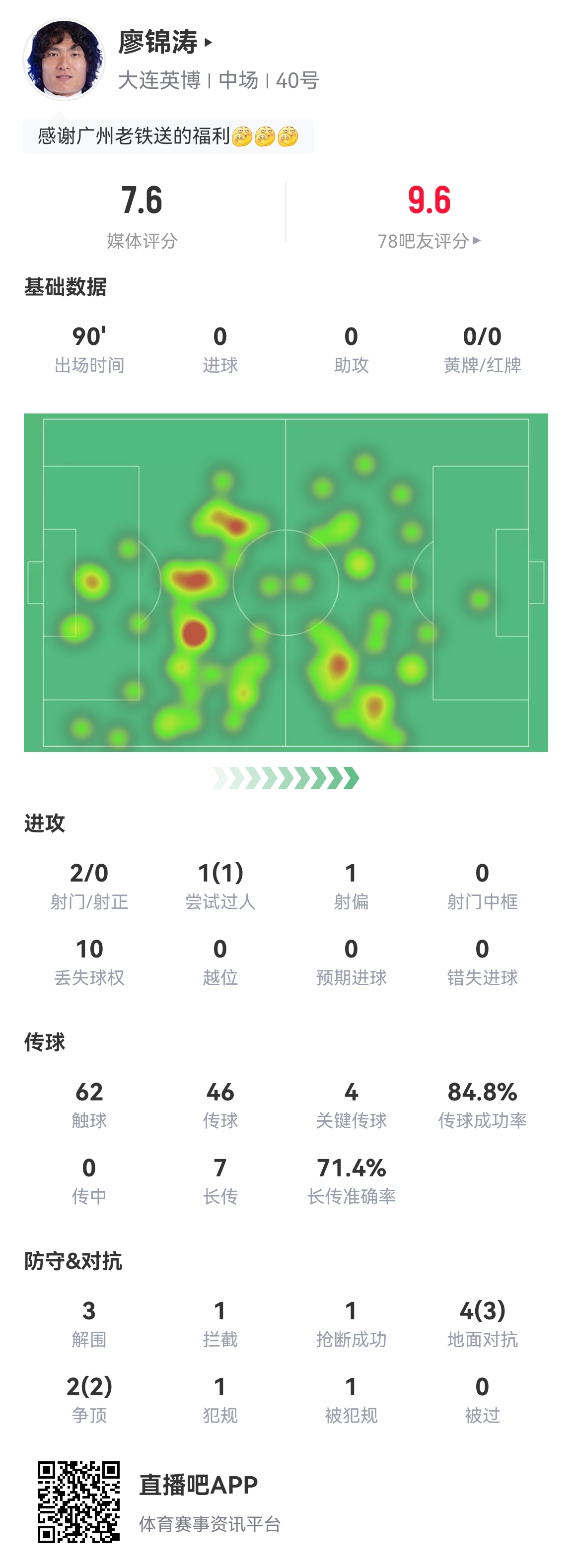 03月29日訊 大連英博2-0完勝長春亞泰,25歲的英博后腰廖錦濤發(fā)揮穩(wěn)健,攻防一體,傳球成功率85%,貢獻(xiàn)1次成功過人和1次射門,防守端3次解圍,2次成功爭頂,4次對抗3次成功,他的發(fā)揮也得到了吧友的稱贊!