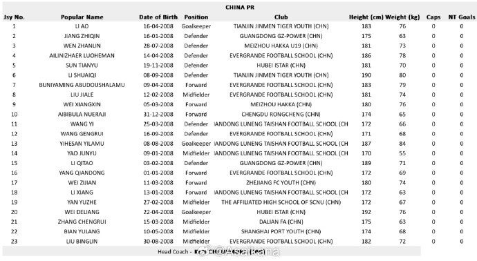 中場:8-劉佳樂(恒大足校)、14-姚俊宇(魯能足校)、19-閆宇喆(華南師范大學(xué)附屬中學(xué))、21-張城瑞(大連足協(xié))、22-卞宇郎(上海海港)、23-劉柄麟(恒大足校)