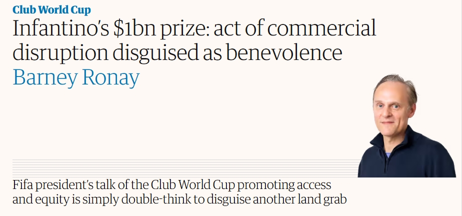 對(duì)此衛(wèi)報(bào)記者Barney Ronay撰文對(duì)世俱杯進(jìn)行抨擊,認(rèn)為這一賽事龐大的獎(jiǎng)金總數(shù)看似很美好,但對(duì)足球生態(tài)存在負(fù)面影響,更是將其稱為“披著善意外衣的商業(yè)顛覆行為”。
