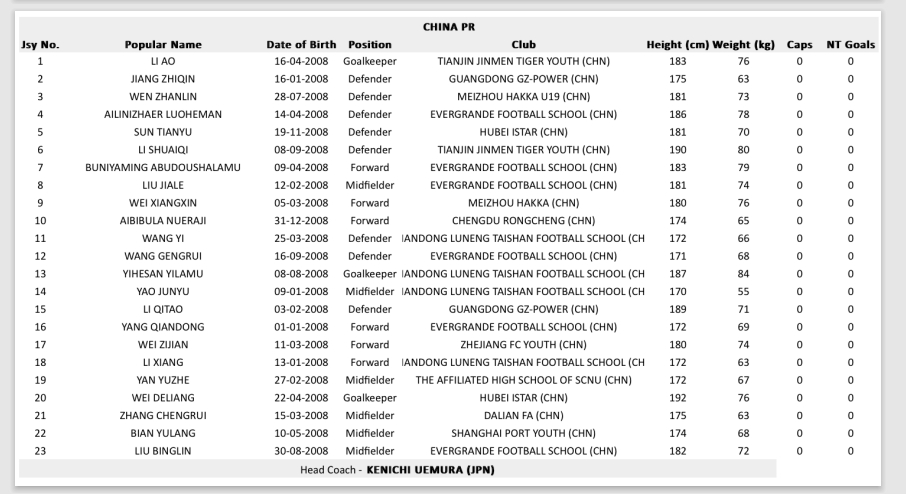 03月29日訊 亞足聯(lián)官方公布U17亞洲杯各隊23人名單,中國隊名單中艾比布拉領(lǐng)銜,魏祥鑫、布尼亞明在列。這支U17國足由上村健一掛帥,近期在迪拜集訓(xùn)期間,球隊共打了4場熱身賽,均失利。