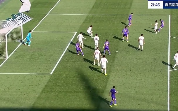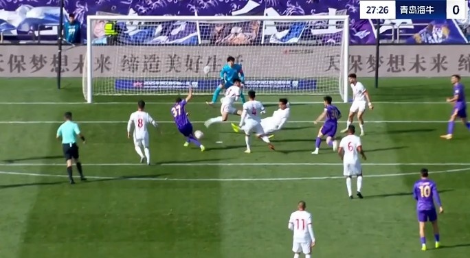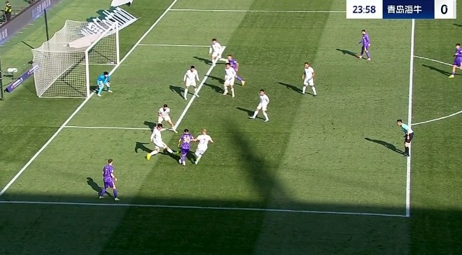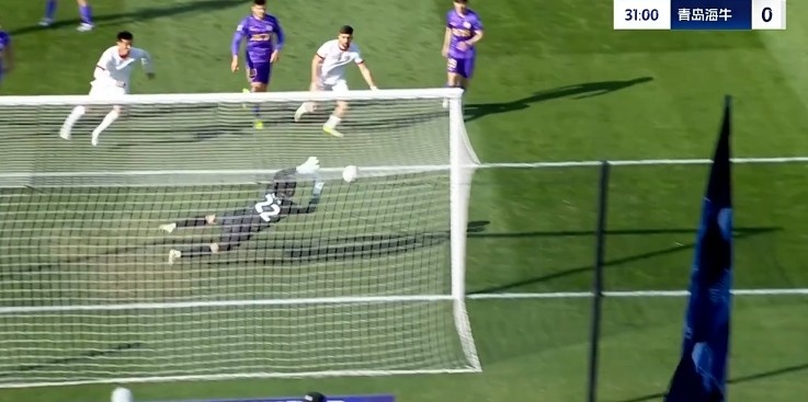 第31分鐘,青島海牛禁區(qū)里一次頭球攻門被門將飛身撲出底線?!?/p>