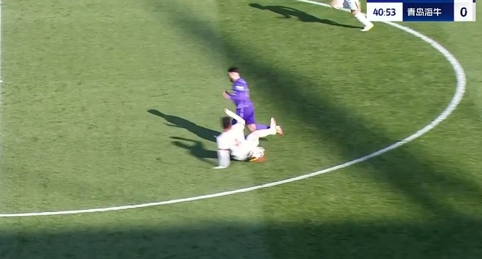 第40分鐘,金洋洋中場攔截飛鏟踢倒進攻球員,主裁判第一時間出示黃牌?!?/p>