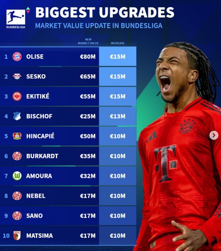 3月30日訊 《轉(zhuǎn)會(huì)市場》在此前更新了德甲球員身價(jià),并列出了身價(jià)升值幅度最大情況,奧利塞等3人領(lǐng)銜。