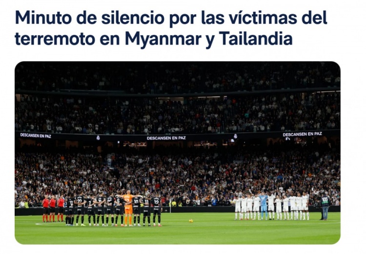 3月30日訊 本輪西甲賽前,皇馬和萊加內(nèi)斯兩隊(duì)列隊(duì)為緬甸、泰國地震遇難者默哀。皇馬官網(wǎng)寫道:圣地亞哥-伯納烏球場(chǎng)在皇家馬德里與萊加內(nèi)斯的比賽開始前默哀一分鐘,悼念緬甸和泰國地震中的數(shù)千名遇難者。兩隊(duì)球員都佩戴了袖標(biāo)。 本文標(biāo)簽: 足球 西甲 皇家馬德里 萊加內(nèi)斯