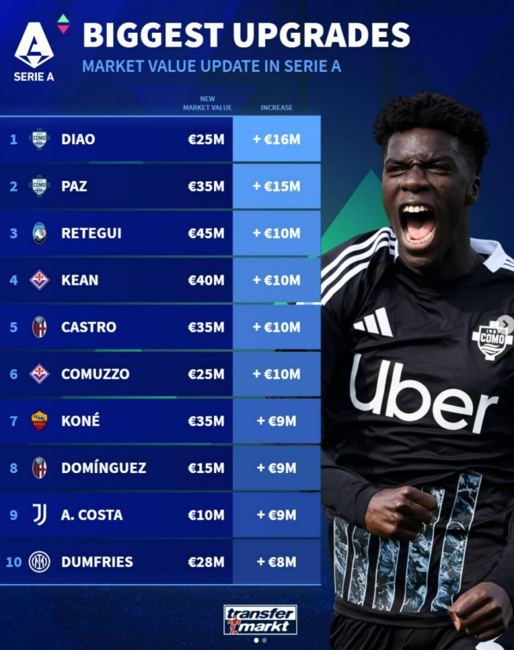 3月30日訊 德轉(zhuǎn)此前更新了意甲球員身價(jià),并盤(pán)點(diǎn)了升值最高的10人榜單,其中曼聯(lián)引援目標(biāo)小將迪奧居首,以下為具體榜單: