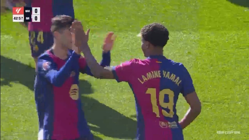 03月30日訊 西甲第29輪,巴塞羅那vs赫羅納。比賽第44分鐘,亞馬爾任意球打在了克雷吉奇的身上彈進(jìn)球門,巴薩1-0領(lǐng)先!